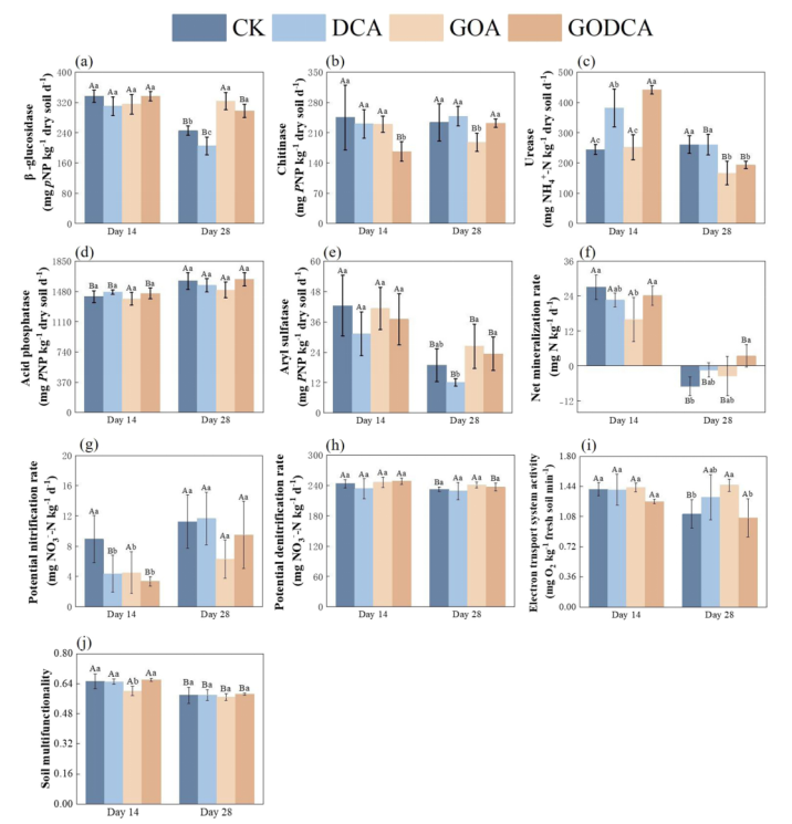 圖2. 氧化石墨烯暴露和硝化抑制劑對土壤(a) β-葡萄糖苷酶、(b)幾丁質(zhì)酶、(c)脲酶、(d)酸性磷酸酶和(e)芳基硫酸酯酶活性的影響;(f)凈氮礦化,(g)潛在硝化作用,(h)潛在反硝化速率;(i)電子傳遞系統(tǒng)活動;(j)多功能性。CK,空白對照;DCA、DCD應(yīng)用;GOA,氧化石墨烯暴露;GODCA、氧化石墨烯+ DCD應(yīng)用。圖中不同小寫字母表示相同孵育時間的4個不同處理間差異顯著,大寫字母表示相同孵育時間的2個處理間差異顯著(P = 0.05)。