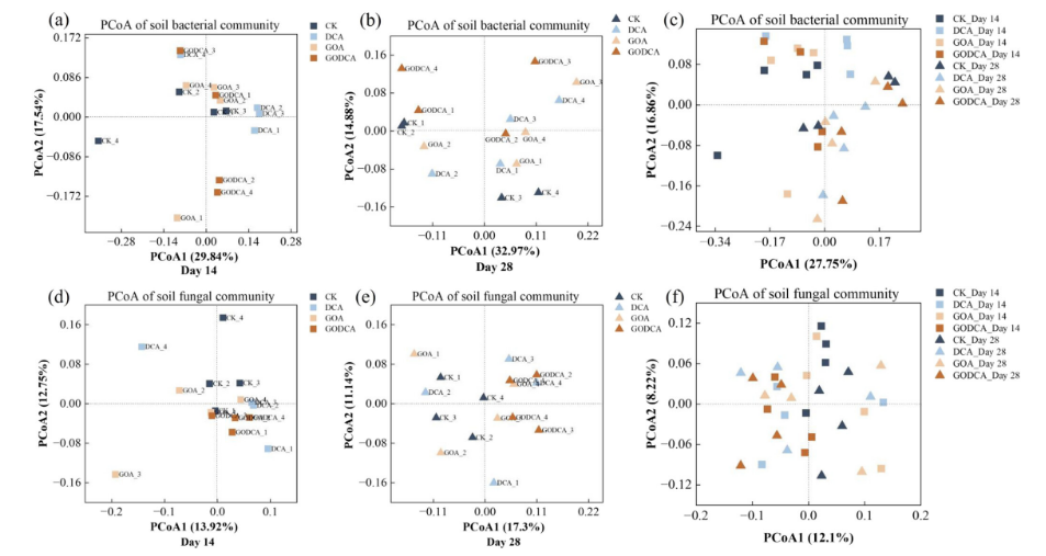 圖6. 氧化石墨烯暴露和硝化抑制劑施用對(a)第14天、(b)第28天和(c)所有孵育時間土壤細菌群落結(jié)構(gòu)的影響,以及(d)第14天、(e)第28天和(f)所有孵育時間土壤真菌群落結(jié)構(gòu)的影響。CK,空白對照;DCA、DCD應(yīng)用;GOA,氧化石墨烯暴露;GODCA、氧化石墨烯+ DCD應(yīng)用。