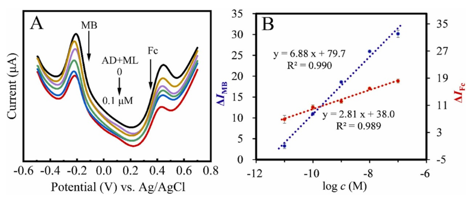 圖 5. (A)適體傳感器測定不同濃度AD和ML的SWV曲線;(B)MB和Fc的峰電流變化與AD和ML濃度的對數(shù)值分別呈線性關(guān)系。