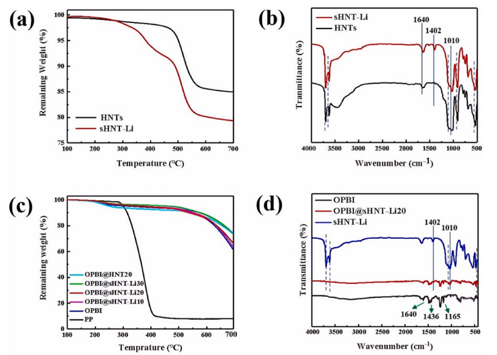 圖 2. (a)HNTs、sHNT-Li的TGA曲線(xiàn)和(b)FT-IR光譜;(c)隔膜的TGA曲線(xiàn);(d)OPBI、OPBI@sHNT-Li20隔膜和sHNT-Li的FT-IR光譜。