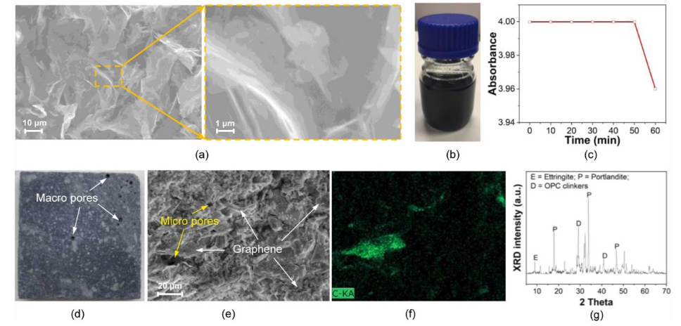 圖3. 宏觀和微觀形貌和階段:(a)石墨烯的微觀結(jié)構(gòu);(b)石墨烯懸浮液;(c)石墨烯懸浮液的吸光度;(d)水泥基TENG的表面形貌;(e)和(f)石墨烯-水泥復(fù)合材料在碳元素上的微觀結(jié)構(gòu)和EDX結(jié)果;(g)研磨的石墨烯-水泥粉末的XRD結(jié)果。