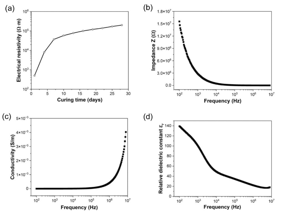 圖 4. 石墨烯-水泥復(fù)合材料的電學(xué)和介電性能:(a)直流固化過(guò)程中的電阻率發(fā)展;(b)水泥基板的阻抗;(c)水泥基板的電導(dǎo)率;(d)隨頻率變化的相對(duì)介電常數(shù)。