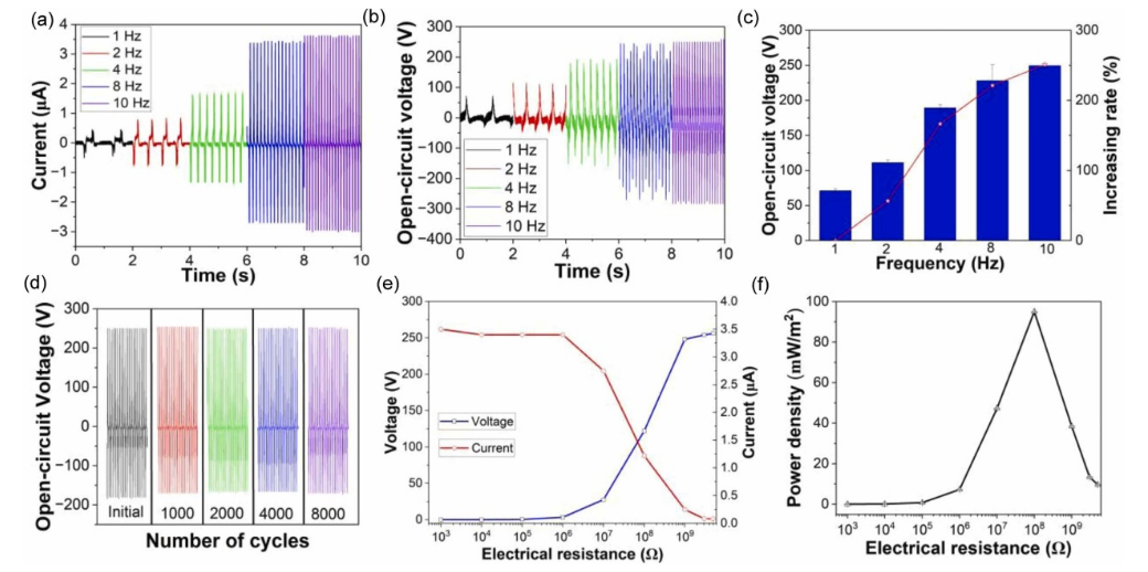圖 5. 100 N 力作用下水泥基 TENG 的摩擦電性能:(a)頻率從 1 到 10 Hz 變化的短路電流;(b)使用 3 G© 電阻器時(shí)頻率變化的開路電壓;(c)電壓與頻率;(d)數(shù)千次循環(huán)后的穩(wěn)定性;(e)和(f)不同負(fù)載電阻值下水泥基 TENG 輸出電壓、電流和功率密度。