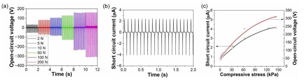 圖 6. 力幅對(duì)開路電壓和短路電流輸出的影響:(a)2、5、10、50、100 和 200 N 下的電壓輸出;(b)200 N 下的短路電流;(c)電壓和電流輸出與壓力的關(guān)系。