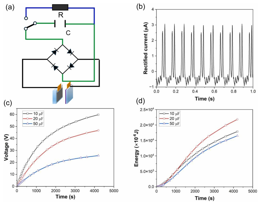 圖7. 水泥基 TENG 的充電性能:(a) 電容器充電電路圖;(b) 整流短路電流;(c) 和 (d) 水泥基 TENG 充電的 10、20 和 50 ¼F 電容器的電壓和能量曲線。