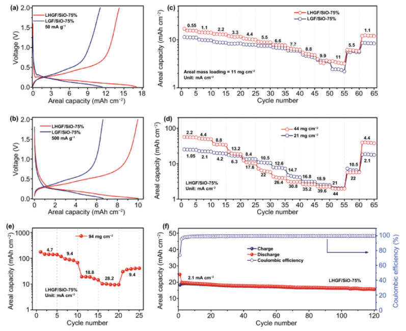Fig 3. 兩種類(lèi)型的電極在(a) 50 mA g?¹和(b) 500 mA g?¹時(shí)的恒流充放電曲線,質(zhì)量負(fù)荷為11 mg cm?²;(c) LHGF/SiO-75%和LGF/SiO-75%電極在質(zhì)量負(fù)載為11 mg cm?²時(shí)的倍率性能;(d) LHGF/SiO-75%電極在21和44 mg cm?²質(zhì)量負(fù)載下的倍率性能;(e) LHGF/SiO-75%電極在質(zhì)量負(fù)載為94 mg cm?²時(shí)的倍率性能;(f) LHGF/SiO電極在2.1 mA cm?²電流密度下,負(fù)載質(zhì)量為21 mg cm?²的循環(huán)性能。