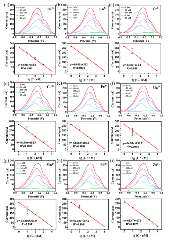 重金屬污染因其高毒性、不可生物降解性和致癌性而引起全球關(guān)注。電化學(xué)傳感器廣泛用于檢測低濃度的重金屬離子 (HMI)。然而,它們的適用性通常僅限于檢測僅在水溶液中表現(xiàn)出電化學(xué)信號的離子。在這項(xiàng)研究中,我們提出了一種基于辣根peroxidase@zeolitic咪唑酸鹽骨架-8/硫氨酸/金/離子液還原氧化石墨烯 (HRP@ZIF-8/THI/Au/IL-rGO) 改性的多響應(yīng)檢測平臺。該平臺展示了其檢測各種金屬離子的能力,包括那些沒有常規(guī)電化學(xué)信號的金屬離子。Au/IL-rGO 復(fù)合結(jié)構(gòu)增強(qiáng)了可用于反應(yīng)的比表面積。此外,HRP@ZIF-8 的原位生長不僅在檢測前屏蔽了 THI 信號,而且還保護(hù)了電極材料。值得注意的是,引入的乙二胺四乙酸二鈉二水合物 (EDTA) 具有與各種 HMI 復(fù)合的能力。當(dāng)存在過量的 EDTA 時,它可以裂解 ZIF-8 并釋放 HRP。在過氧化氫 (H