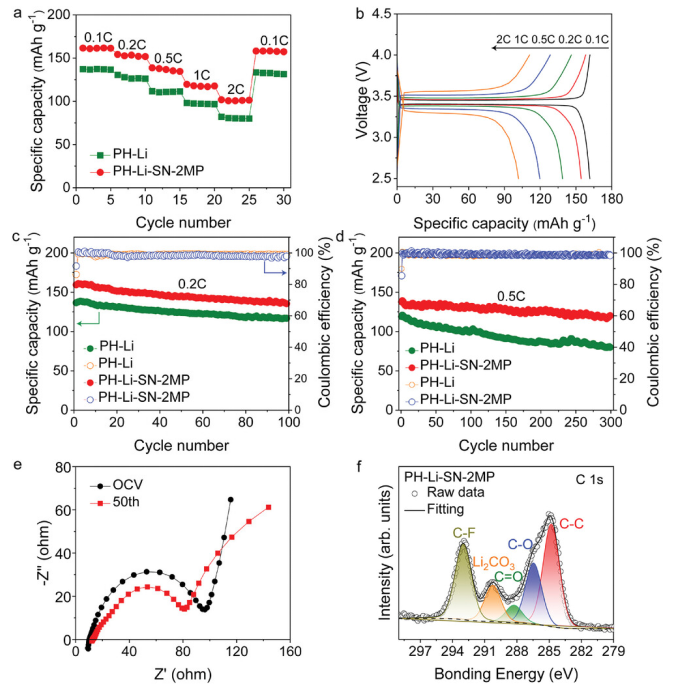 Fig 6. a) Li/PH-Li/LFP和Li/PH-Li-SN−2MP/LFP電池的倍率性能。b) Li/PH-Li-SN−2MP/LFP電池在不同倍率下的充放電曲線。c) Li/PH-Li/LFP和Li/PH-Li-SN−2MP/LFP電池在0.2 C下的循環(huán)性能。d) Li/PH-Li/LFP和Li/PH-Li-SN−2MP/LFP電池在0.5 C下的循環(huán)性能。e) Li/PH-Li-SN−2MP/LFP電池初始和50個(gè)循環(huán)后的EIS曲線。f) Li/PH-Li-SN−2MP/LFP全電池在0.5 C下50個(gè)循環(huán)后LFP陰極的C 1s核級(jí)區(qū)域的XPS圖譜。