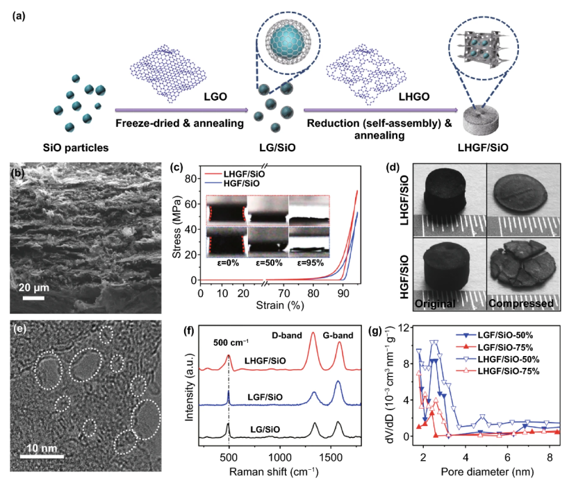 Fig 1. (a) LHGF/SiO復(fù)合材料的制備工藝;(b) 壓縮后復(fù)合材料橫截面SEM圖;(c) LHGF/SiO和普通多孔石墨烯與一氧化硅制備的復(fù)合電極(HGF/SiO)的單軸壓縮率(95%);插圖:LHGF/SiO和HGF/SiO復(fù)合材料在單軸壓縮時的光學(xué)照片;(d) 機械壓縮(95%)前后對應(yīng)結(jié)構(gòu)的照片;(e) 具有納米孔的石墨烯薄片的TEM圖;(f) LHGF/SiO、LGF/SiO和LG/SiO復(fù)合材料的拉曼光譜;(g) LHGF/SiO和LGF/SiO復(fù)合材料的BJH孔徑分布比較。