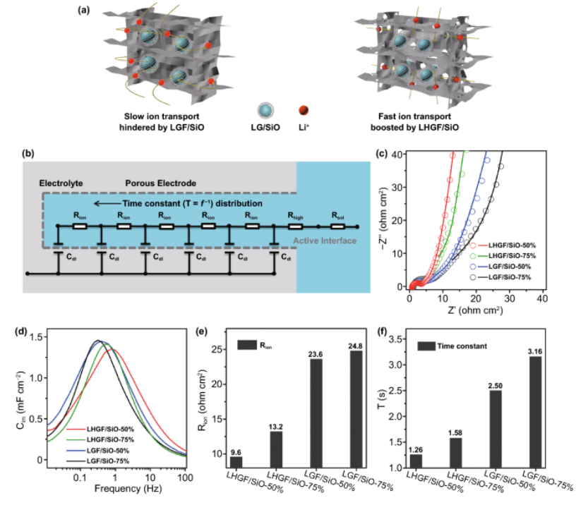 Fig 2. (a) LHGF/SiO和LGF/SiO電極中的Li?輸運示意圖;(b) 多孔電極結(jié)構(gòu)示意圖和等效電路模型;(c)對稱電極得到復(fù)合材料的Nyquist圖。符號和實線分別代表實驗和模擬結(jié)果;(d) 各種復(fù)合電極在質(zhì)量負荷為11 mg cm?²時;電容的虛部作為頻率的函數(shù)圖。(e) 不同復(fù)合電極的離子電阻(Rion)值;(f) 不同復(fù)合電極的時間常數(shù)(T)的函數(shù)值。