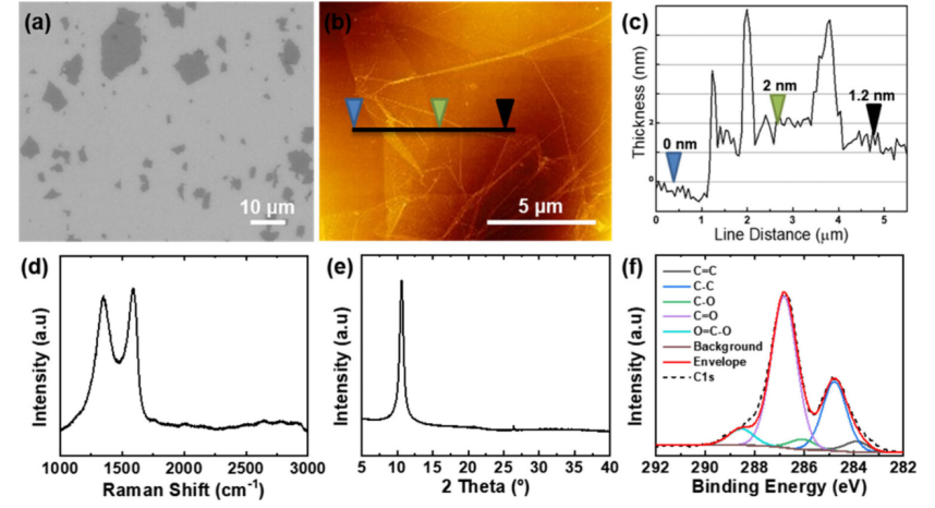 圖2. 氧化石墨烯薄片的結(jié)構(gòu)和化學(xué)特性。(a)放置在二氧化硅襯底上的氧化石墨烯薄片的SEM圖像。(b)氧化石墨烯薄片的原子力顯微鏡圖像。(c)氧化石墨烯薄片沿(a)、(d)拉曼(Raman)、(e) XRD、(f)氧化石墨烯粉末XPS C1s譜線的譜線輪廓。