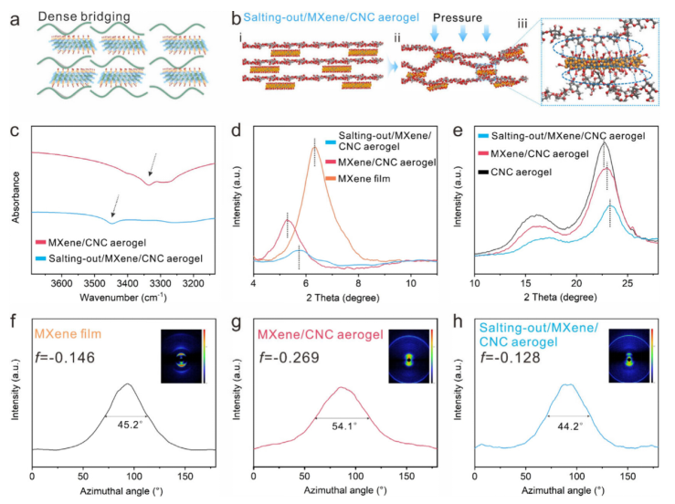 Fig 3. 密集橋接的構建。(a) 緊湊橋的示意圖。(b) 在模擬壓縮過程中 Salting-out/MXene/CNC 氣凝膠的模型快照。(c) 氣凝膠的 FTIR 光譜。(d) MXene 薄膜、MXene/CNC 氣凝膠和 Salting-out/MXene/CNC 氣凝膠的 XRD 圖譜。(e) CNC 氣凝膠、MXene/CNC 氣凝膠和 Salting-out/MXene/CNC 氣凝膠的 XRD 圖譜。入射 Cu–Kα X 射線束平行于片狀平面,002 峰的相應方位掃描圖譜的 WAXS 圖譜(f) MXene 薄膜,(g) MXene/CNC 氣凝膠,(h) Salting-out/MXene/CNC 氣凝膠。