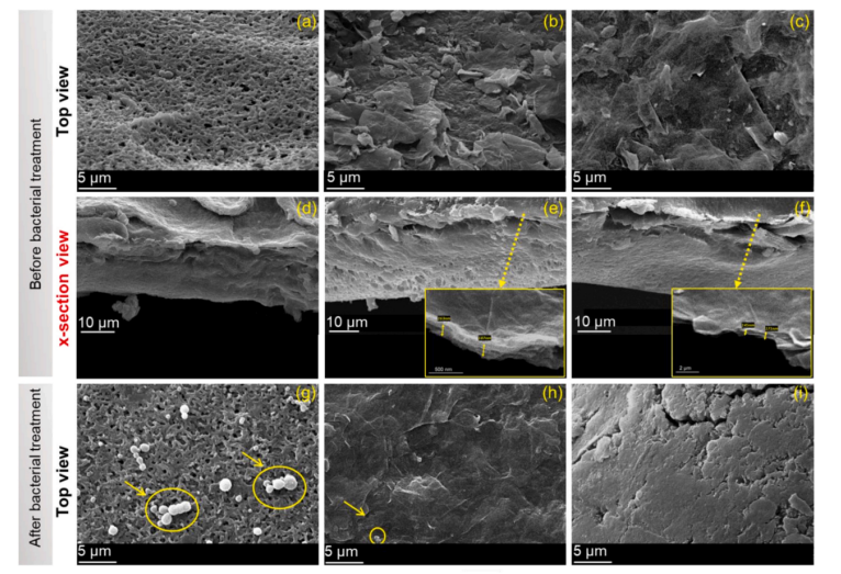 圖2. a-c NY、NYGO 和 NGO-Lys 膜的頂視圖。d-f 相同膜以相似順序的橫截面圖像。g-i E. 糞腸球菌以不同的方式粘附在原始 NY 膜的表面。