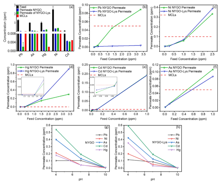 圖4. a:與MCLs相比,飼料中的金屬污染物以及NYGO和NYGO- Lys膜的滲透物的ICPMS數(shù)據(jù)。(b-f):表示NYGO和NYGO- Lys復(fù)合膜滲透液中Pb、Ni、Hg、Cd和As的殘留濃度隨進料濃度的變化趨勢,ERL位于趨勢線與MCLs的交點。(g和h) pH影響NYGO和NYGO- Lys復(fù)合膜在恒定進料濃度下保留金屬的能力,即所有進料濃度均為1ppm。