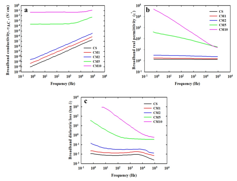 圖 4. 3D 打印殼聚糖/MXene 氣凝膠的 (a) 寬帶交流電導(dǎo)率、(b) 介電常數(shù)和 (c) 介電損耗。