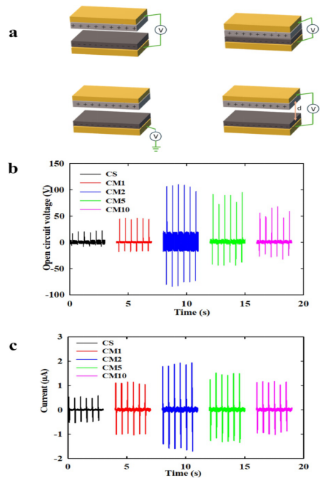 圖 7. (a) TENG 層的示意圖,(b) 3D 打印殼聚糖和殼聚糖/MXene 氣凝膠的開(kāi)路電壓曲線,(c) 3D 打印殼聚糖和殼聚糖/MXene 氣凝膠的電流曲線。