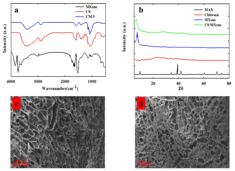 圖3. (a) 印刷氣凝膠的 FTIR 光譜,(b) MAX、MXene、殼聚糖和印刷殼聚糖/MXene 氣凝膠的 XRD 圖案。印刷的 (c) CS 和 (d) CM10 的 SEM 圖像。