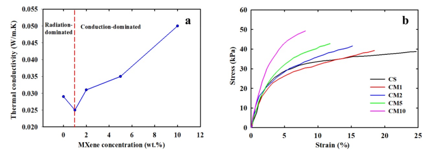 圖 6. 3D 打印殼聚糖/MXene 氣凝膠的 (a) 熱導(dǎo)率和 (b) 應(yīng)力-應(yīng)變曲線。