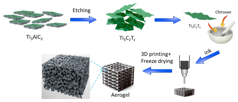 圖 1. 3D打印殼聚糖/MXene氣凝膠的制備。