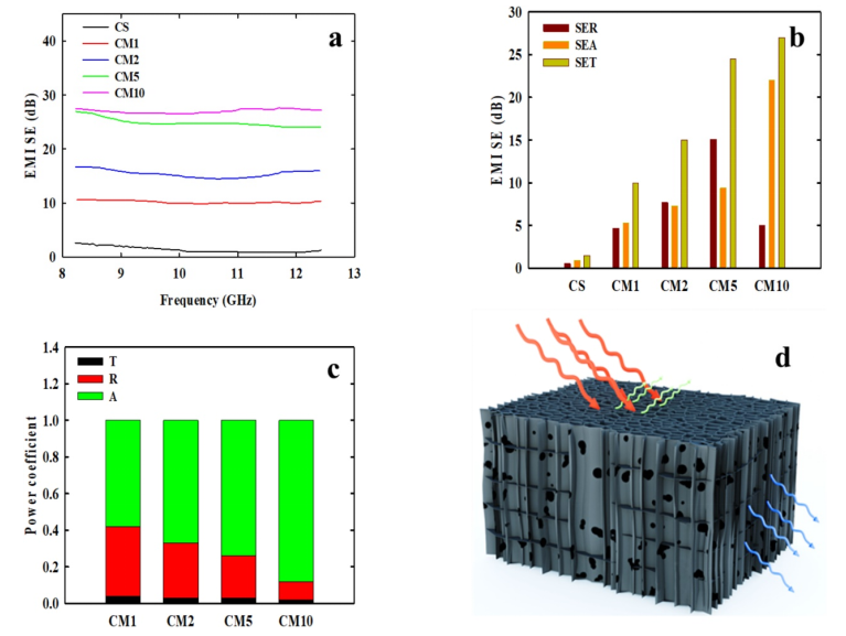 圖 5. 3D 打印殼聚糖/MXene 氣凝膠在 (a) 8-12 GHz 下的 EMI 屏蔽效能 (b) SER、SEA 和 SET 的貢獻(xiàn),(c) R、A 和 T 的貢獻(xiàn),以及 (d) 打印氣凝膠中 EMI 屏蔽機(jī)制的示意圖。