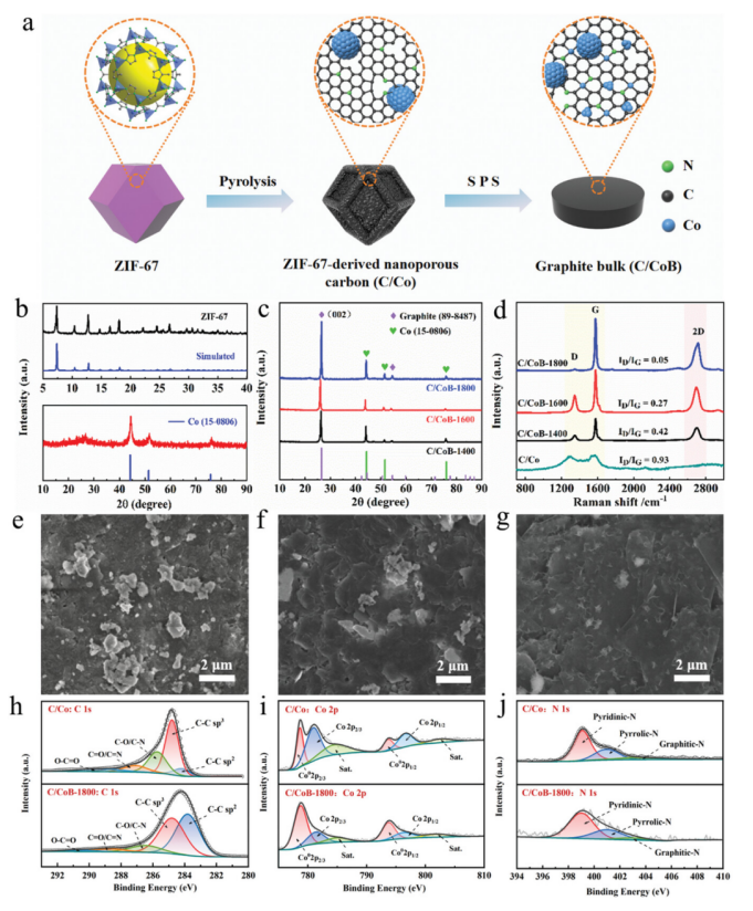 同時具有優(yōu)異電導(dǎo)率和強度的高性能塊狀石墨 (HPBG) 需求量很大,但它仍然至關(guān)重要且具有挑戰(zhàn)性。本文介紹了一種新方法,利用 MOF 衍生的納米多孔金屬/碳復(fù)合材料作為前體來規(guī)避這種傳統(tǒng)的權(quán)衡。所得的塊狀石墨由密集堆積的多層石墨烯片組成,這些石墨烯片用多種鈷形式(納米顆粒、單原子和簇)功能化,在各個方向上表現(xiàn)出前所未有的電導(dǎo)率(平面內(nèi):7311 S cm?¹,平面外:5541 S cm?¹)和優(yōu)異的機械強度(彎曲:101.17±5.73 MPa,壓縮:151.56±2.53 MPa)。Co 納米顆粒充當(dāng)自催化劑和粘合劑,通過放電等離子燒結(jié)促進高度石墨化的石墨烯層之間的強層間粘附。石墨和 Co 之間的強納米界面在石墨烯納米片之間創(chuàng)建了關(guān)鍵橋梁,促進了高效的電子遷移,并提高了組裝的塊狀納米復(fù)合材料的強度和剛度。利用這些卓越的性能,實際演示凸顯了這種堅固材料在需要卓越電磁干擾屏蔽和高效加熱的應(yīng)用中的巨大潛力。一種創(chuàng)新的方法有效地將電導(dǎo)率與機械性能分離,為創(chuàng)建適合不同應(yīng)用領(lǐng)域的 HPBG 鋪平了道路。