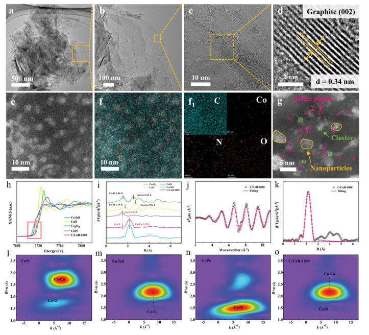 圖 2. (C/CoB-1800 的微觀結(jié)構(gòu)特征和化學(xué)結(jié)構(gòu)。a) TEM 圖像。b) 詳細(xì)放大的 TEM 圖像。c) HRTEM 圖像。d) 詳細(xì)放大的 HRTEM 圖像。e) 碳基質(zhì)區(qū)域的 HAADF-STEM 圖像。f-f1) Co、N、C 和 O 的元素映射圖像。g) Co 的詳細(xì)放大 HAADF-STEM 圖像。h) Co K 邊 XANES 光譜,i) Co 箔、CoPc、Co3O4、CoO 和 C/CoB-1800 在 R 空間中的 EXAFS 光譜。j) Co k3 ?(k) 振蕩曲線,k) C/CoB-1800 的 EXAFS 光譜的傅里葉變換和相應(yīng)的擬合曲線。l–o) CoO、Co 箔、CoPc 和 C/CoB-1800 的小波變換 (WT)。