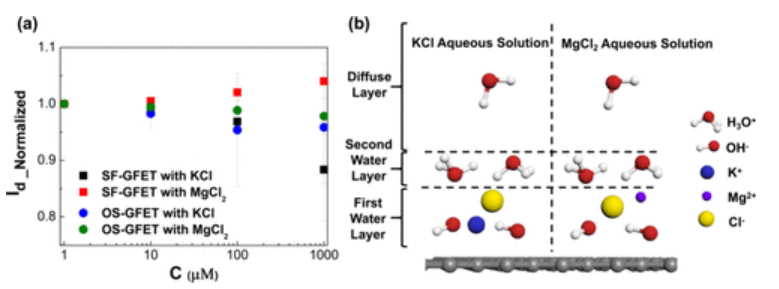 圖9.比較了SF-GFET和OS-GFET-GFET在1μM和1 mM KCl環(huán)境中的凈場(chǎng)效應(yīng)電流(ΔI)和界面電容(C)。對(duì)于SF-GFET(疏水表面),凈場(chǎng)效應(yīng)電流(ΔI)很??;相比之下,OS-GFET(親水表面)在柵電壓掃描過(guò)程中表現(xiàn)出峰值電流行為。
