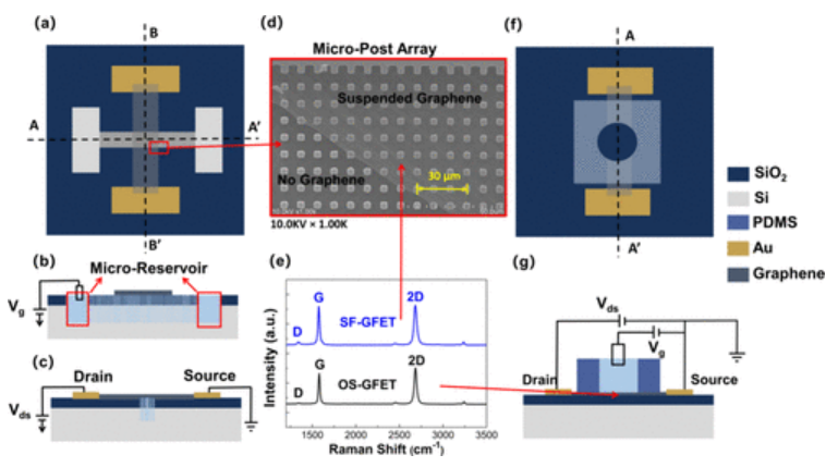 圖1. SF-GFET/OS-GFET裝置示意圖和測(cè)量圖。(a) SF-GFET設(shè)備俯視圖。(b) SF-GFET裝置橫截面A–A′方向視圖。(c) SF-GET裝置橫截面B–B′方向的視圖。(d) SF-GFET器件中石墨烯懸浮在微孔陣列上的SEM圖像。(e) SF-GFET器件中懸浮石墨烯(藍(lán)線(xiàn))和OS-GFET器件中支撐石墨烯(黑線(xiàn))的拉曼光譜。(f) OS-GFET設(shè)備的俯視圖。(g) OS-GFET設(shè)備橫截面C–C′方向視圖。