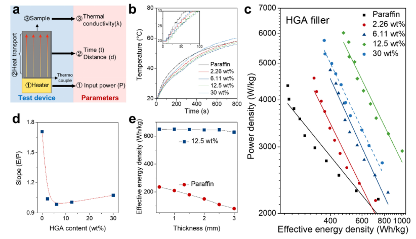Fig 4. PGC 的有效能量密度和功率密度。(a) PCM 的有效能量密度和功率密度的原型設(shè)備及其相關(guān)參數(shù)。(b) 在輸入功率為 0.34 W 時,石蠟和 PGC 的溫度升高曲線。(c) 石蠟和 PGC 的有效能量密度與功率密度的關(guān)系。30 wt%處有效能量密度和功率密度的下降用虛線標記。(d) PGC 的斜率(E/P)與 HGA 含量的關(guān)系。(e) 石蠟和含有 12.5 wt% HGA 填料的 PGC 的有效能量密度隨厚度的變化。
