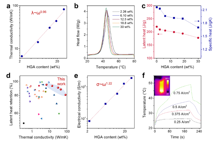 Fig 3. PGC 的熱和電加熱特性。(a) HGA 含量與 PGC 熱導率之間的關(guān)系。(b) 不同 HGA 含量的 PGC 的 DSC 曲線。(c) PGC 的潛熱和比熱隨 HGA 含量的變化。(d) 潛熱保持與熱導率的比較,參考之前的研究。(e) HGA 含量與 PGC 電導率之間的關(guān)系。(f) PGC 在不同電流密度下的溫度上升曲線及其在 0.75 A/cm
