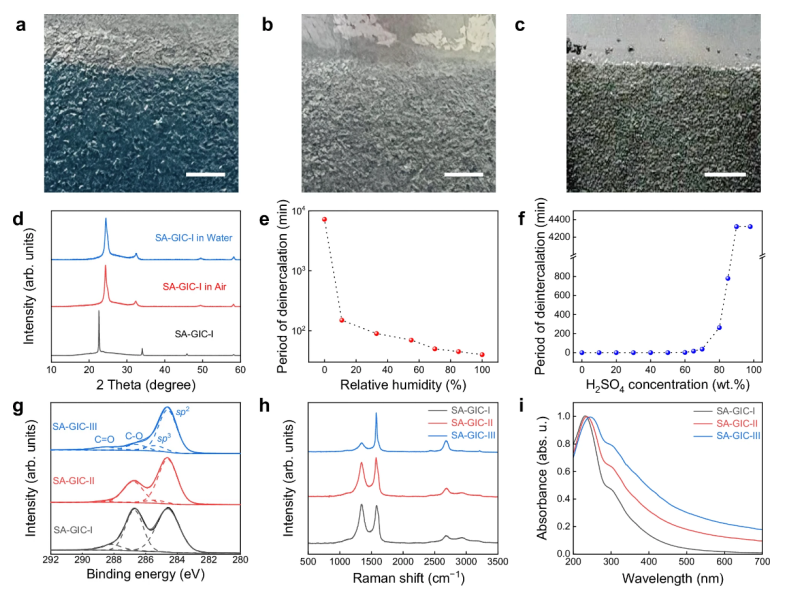圖1. 新合成的SA-GIC-I(a,藍(lán)色區(qū)域)、通過(guò)空氣中吸水去除的SA-GIC(b,淺灰色區(qū)域,在20°C下70%濕度的空氣中放置50 min)和通過(guò)水中吸水去除的SA-GIC(C,深灰色區(qū)域,浸入水中5 s)的照片。d(a?c)中所示樣品的相應(yīng)X射線衍射(XRD)圖。比較了SA-GIC-I在不同濕度(e)的空氣和不同SA濃度(f)的SA水溶液中的脫層時(shí)間。Ⅰ、Ⅱ、Ⅲ級(jí)SA-GIC乳液電解氧化制備GO片的性質(zhì):(g)擬合的X射線光電子能譜(XPS)譜,其中虛線顯示對(duì)應(yīng)于不同C結(jié)合模式的去卷積峰;(h) 拉曼光譜;(i) 紫外-可見(jiàn)(UV-Vis)光譜。比例尺:(a),1 cm;(b),1 cm;(c),1 cm。