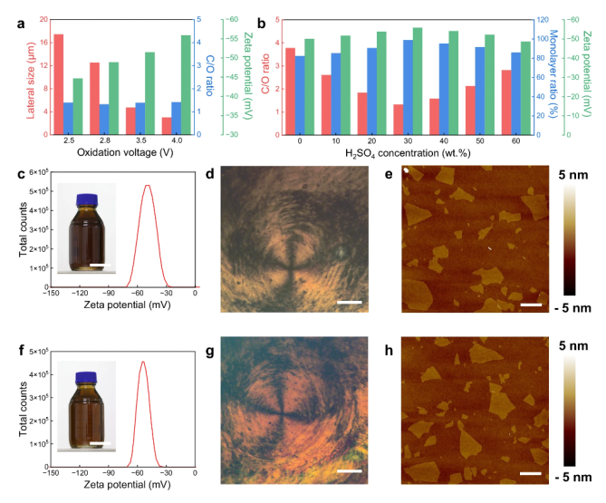 4濃度下合成的GO片的C/O比、單層比與zeta電位之間的關(guān)系。氧化電壓為2.8 V時(shí)純水合成GO的表征:(C),zeta電位(插圖,GO分散);(d) 偏振光顯微鏡(POM)圖像;(e)AFM圖像。在氧化電壓為2.8 V(f)、Zeta電位(插圖,GO分散度)下使用30 wt.%SA合成GO的表征;(g)POM圖像;(h)AFM圖像。比例尺:(c)5 cm(插圖);(d)500μm;(e)10μm;(f)5 cm(插圖);(g)500μm;(h)10μm。