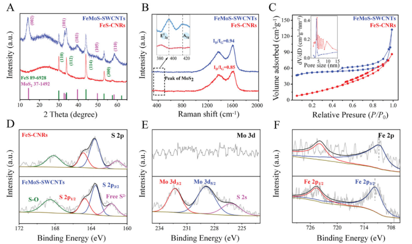 Fig 5. A)FeMoS - 單壁碳納米管和FeS - 碳納米棒的X射線衍射圖;B)拉曼光譜圖;C)N?吸附 - 脫附等溫線及孔徑分布曲線;D)FeMoS - 單壁碳納米管和FeS - 碳納米棒的S 2p X射線光電子能譜;E)Mo 3d X射線光電子能譜;F)Fe 2p X射線光電子能譜。