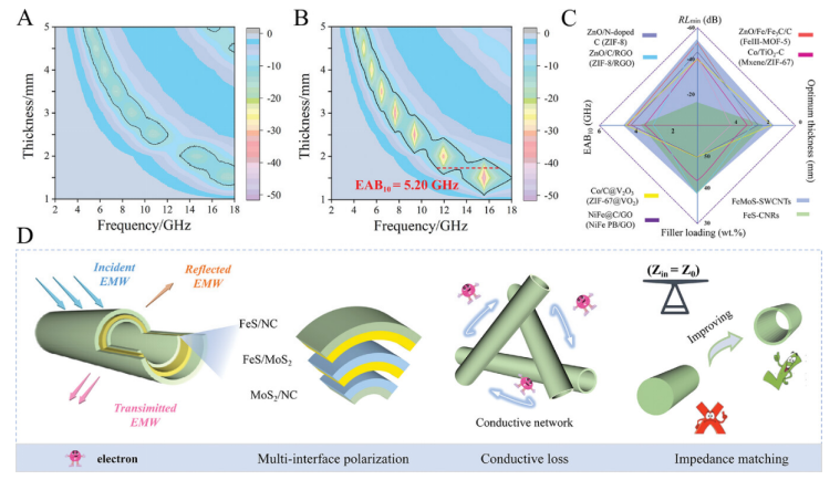 Fig 8. A)FeS - 碳納米棒反射損耗(RL)值的三維示意圖;B)FeMoS - 單壁碳納米管反射損耗(RL)值的三維示意圖;C)FeMoS - 單壁碳納米管與其他已報(bào)道的金屬 - 有機(jī)框架(MOF)衍生吸收劑綜合性能的對比。