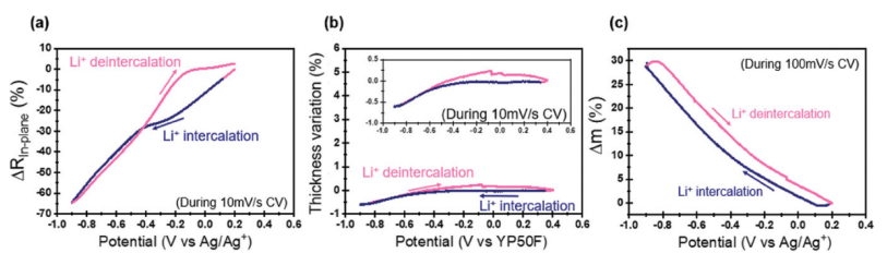 Fig 4. 在循環(huán)伏安法過程中,對Ti3C2Tx在1 M 氯化鋰(LiCl)水系鹽電解質中的以下參數(shù)進行原位測量:a) 面內電阻b) 厚度c) 質量通量。