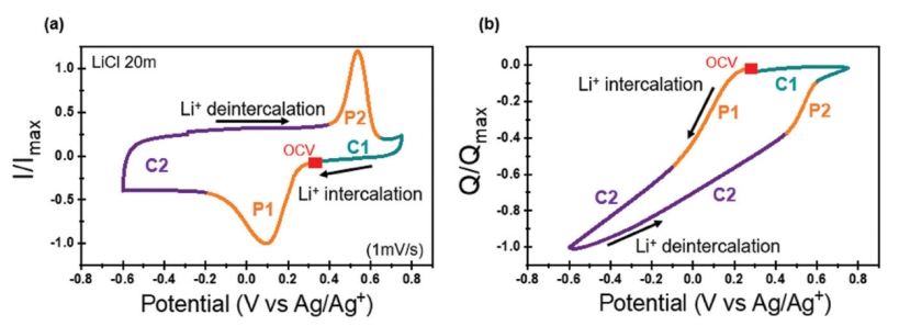Fig 3. a) 在面內電阻測量池中,對獨立的Ti3C2Tx薄膜在1 M 氯化鋰(LiCl)溶液中以10 mV s?¹ 的掃描速率進行循環(huán)伏安測試。電流已歸一化為絕對最大陰極電流值。b) 根據(jù)圖a中所示循環(huán)伏安曲線計算得出的歸一化電荷與電勢關系圖。電荷已歸一化為最大值。