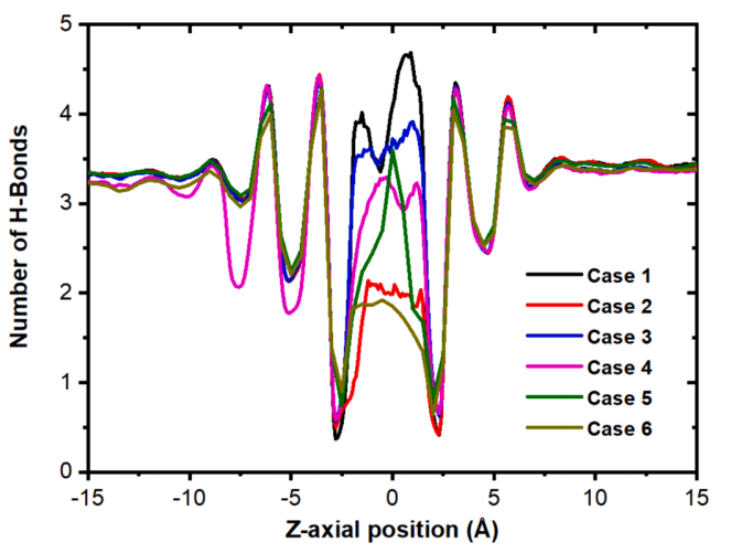 各案例氫鍵分布特征與機(jī)制解析:Case1(G0-CH,小孔徑)分布特征:氫鍵密度在孔道中心形成尖銳單峰(峰值密度~3.2 bonds/nm³),沿Z方向分布范圍狹窄(<1 nm)。氫鍵壽命較長(>10 ps),表明水分子形成穩(wěn)定的類冰結(jié)構(gòu)。