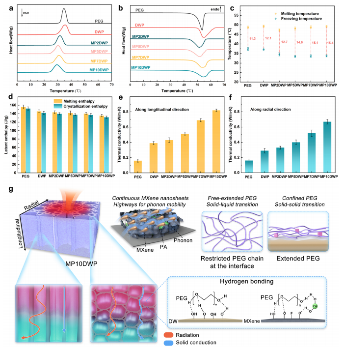 圖5(a)MXene/植酸修飾木材(MPDWP)在冷卻過程中的DSC曲線;(b)加熱過程中的DSC曲線;(c)純PEG、脫木質(zhì)素木材(DWP)及不同MXene/植酸復(fù)合木材(MPDWP)的過冷度對(duì)比;(d)MPDWP的焓值;(e)縱向熱導(dǎo)率與(f)徑向熱導(dǎo)率(純PEG、DWP及MPDWP的對(duì)比);(g)MP10DWP中熱導(dǎo)率增強(qiáng)的潛在機(jī)理(MXene網(wǎng)絡(luò)促進(jìn)熱傳導(dǎo))及相變過程中PEG鏈運(yùn)動(dòng)與分子相互作用示意圖