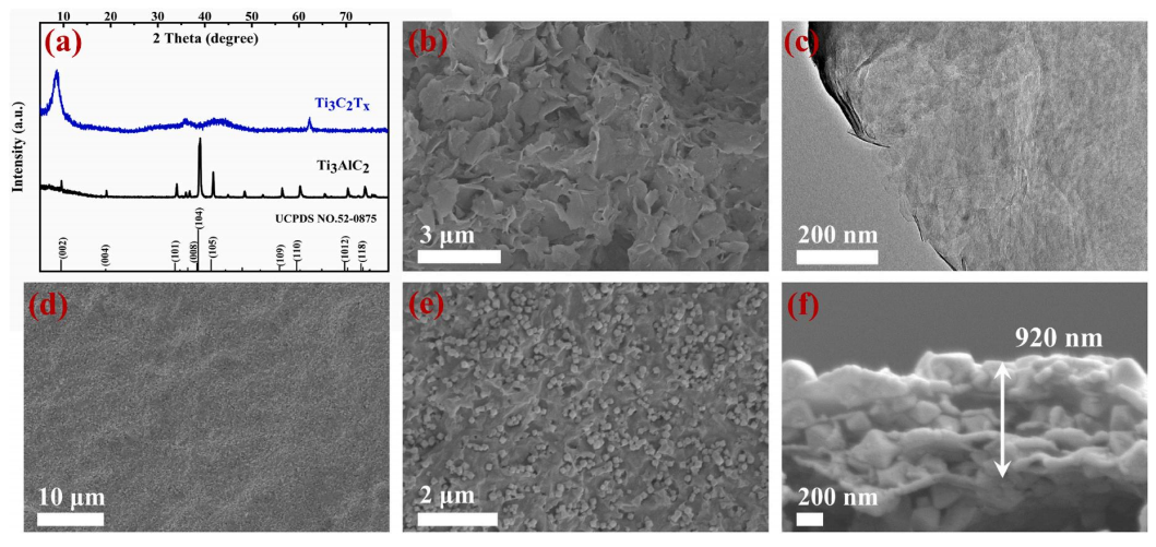 XRD圖譜(圖2a):MAX相(母體材料)經(jīng)化學(xué)蝕刻后,特征峰位移與減弱表明成功剝離為MXene層狀結(jié)構(gòu),同時(shí)保留晶體完整性。