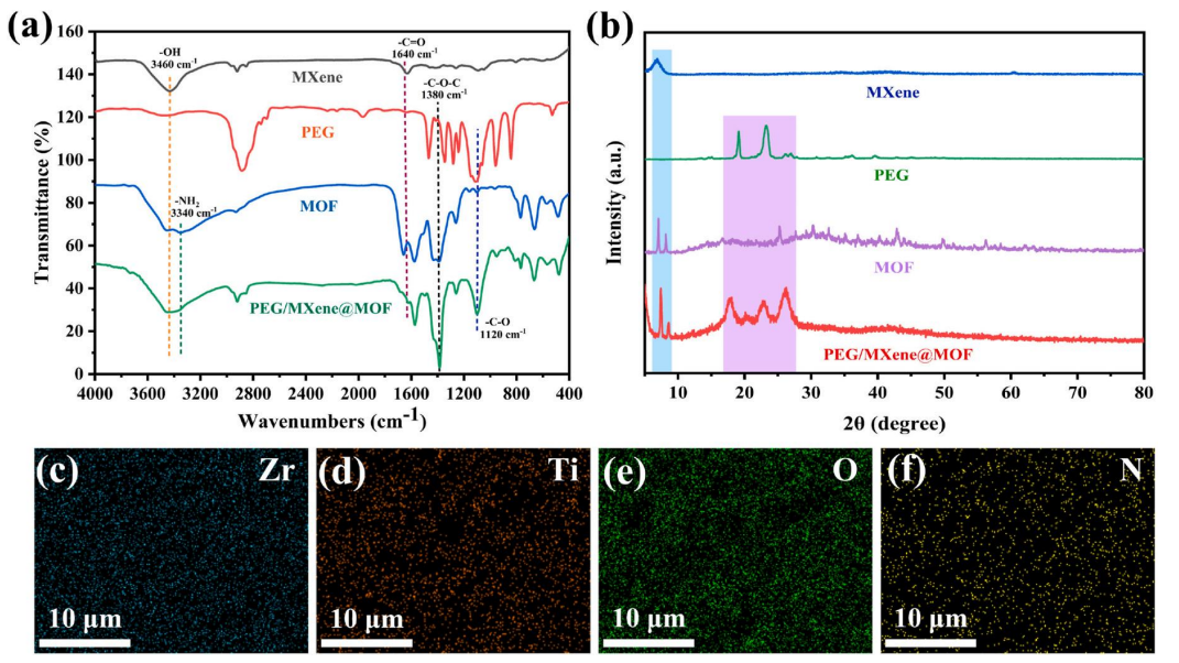 圖4。 (a) MXene、PEG、MOF和PEG/MXene@MOF膜的FTIR和(b)XRD光譜。 (c-f) PEG/MXene@MOF膜的EDS圖像。