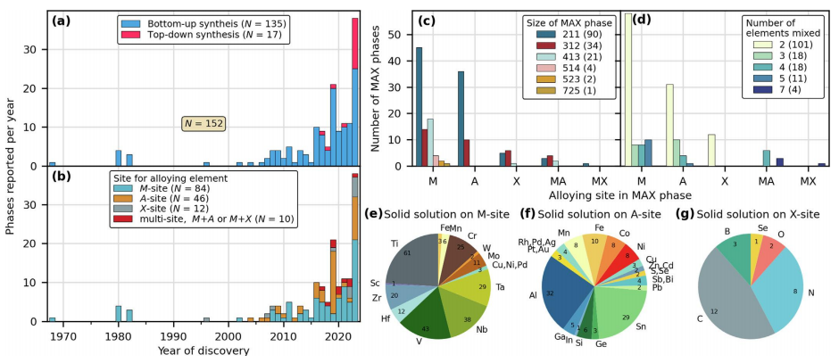 圖4 合成固溶體MAX相的統(tǒng)計(jì)數(shù)據(jù)。根據(jù)(a)自下而上或自上而下的合成路線以及(b)在哪個(gè)位點(diǎn)存在元素混合對(duì)合成相進(jìn)行分類的發(fā)現(xiàn)直方圖。位點(diǎn)依賴統(tǒng)計(jì)量,包括(c)有序性和(d)固溶體中合金元素的數(shù)量。餅圖顯示特定元素在(d)M位、(e)A位和(f)X位上的相應(yīng)出現(xiàn)情況。在(d)和(e)中,由于報(bào)道的出現(xiàn)次數(shù)較少,一些元素被分組在一起。