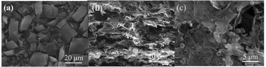 圖2. (a) MIL-53(Fe)、(b) GA 和 (c) GMA-1復(fù)合材料的SEM圖像