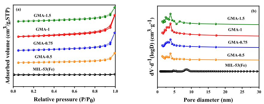 圖4. (a) MIL-53(Fe)和GMA-x復(fù)合材料的N?吸附-脫附等溫線;(b) 孔徑分布曲線