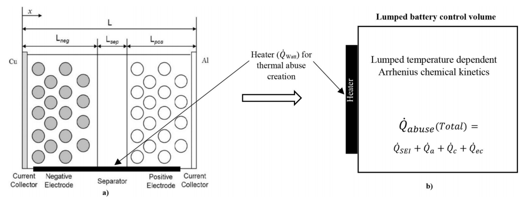 圖2.a) 基于P2D模型的加熱器輔助熱失控原理圖