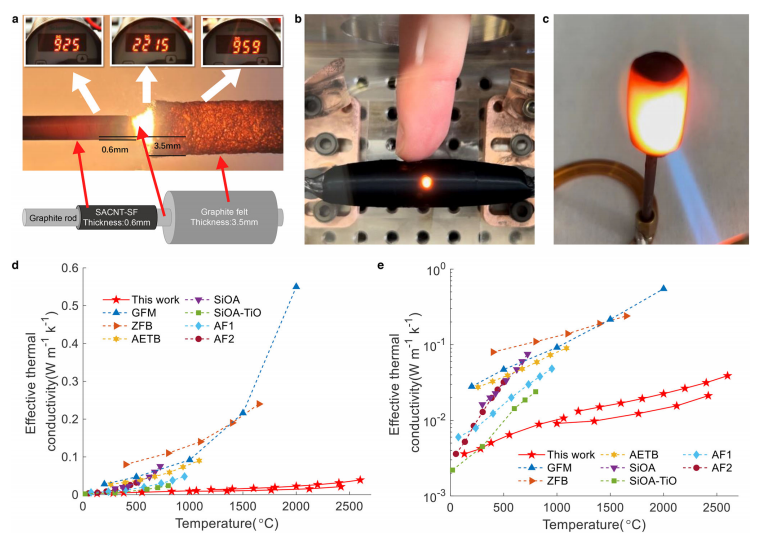 圖2. 超對(duì)齊碳納米管堆疊薄膜(SACNT-SF)的熱絕緣性能。a)一塊0.6毫米厚的SACNT-SF比一塊3.5毫米厚的石墨氈表現(xiàn)出更優(yōu)異的熱絕緣性能。b)內(nèi)部溫度超過2000°C時(shí),觸摸一塊5毫米厚的SACNT-SF表面的照片。c)SACNT-SF暴露在高于1000°C的明火中而不燃燒的照片;測(cè)得的SACNT-SF樣品#1、#3和#5的有效熱導(dǎo)率(用紅色五角星表示;原始數(shù)據(jù)見支持信息中的表S2和表S3),繪制在(d)線性刻度和(e)對(duì)數(shù)刻度上,同時(shí)繪制了先前研究中其他熱界面材料(TIMs)的數(shù)據(jù)(GFM,[1] ZFB,[1] AETB,[17] SiOA,[6] SiOA-TiO,[18] AF1,[3] AF2[2])。