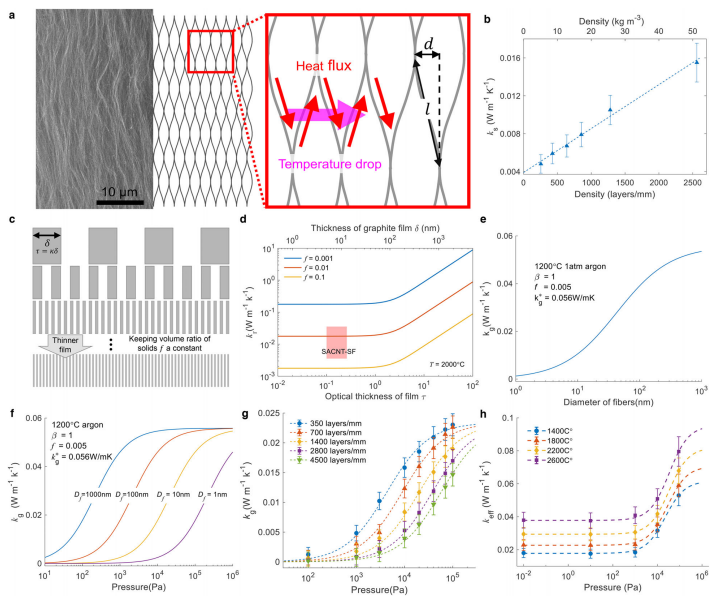 圖3. 熱絕緣材料(TIM)中的熱傳遞模型。a) 通過碳納米管(CNTs)在SACNT-SF中熱傳遞的示意圖。b) SACNT-SF樣品#6的有效熱導(dǎo)率與密度的擬合線圖(虛線);實(shí)心三角形表示在室溫真空下測(cè)量的數(shù)據(jù)。c) 示意圖顯示,在固定固體體積分?jǐn)?shù)f的情況下,通過減少材料厚度可以降低輻射傳熱。d) 在2000°C下,具有不同固體體積分?jǐn)?shù)f的石墨薄膜的輻射熱導(dǎo)率與(光學(xué))厚度的關(guān)系圖。e) TIM中纖維直徑與kg的關(guān)系圖。f) 纖維TIM中氣體壓力與kg的關(guān)系圖。g) 在室溫下測(cè)量的不同密度的SACNT-SF樣品#6中氬氣的熱導(dǎo)率(點(diǎn));虛線表示使用公式(3)的擬合結(jié)果。h) 在氬氣中從1400°C到2600°C測(cè)量的SACNT-SF樣品#3的有效熱導(dǎo)率(點(diǎn));虛線表示使用公式(3)的擬合結(jié)果。