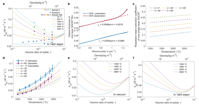 圖4. 提升SACNT-SF熱絕緣性能。a) 在1個(gè)大氣壓的氬氣環(huán)境中測(cè)量的SACNT-SF樣品總熱導(dǎo)率,相對(duì)于固體體積分?jǐn)?shù)f(或密度)在不同溫度下的變化。虛線代表計(jì)算值。b) 單層SACNT薄膜在近紅外波段對(duì)于兩種偏振狀態(tài)的光學(xué)厚度。c) 根據(jù)b)中的數(shù)據(jù)計(jì)算出的,相對(duì)于輻射偏振方向以不同角度排列的單層SACNT薄膜的羅斯蘭德平均消光系數(shù)。d) 在真空環(huán)境中,從1000°C到2600°C,SACNT-SF的熱導(dǎo)率。虛線代表計(jì)算值;實(shí)線表示實(shí)驗(yàn)結(jié)果。e) 在真空環(huán)境中,SACNT-SF的熱導(dǎo)率作為f(或密度)的函數(shù)在不同溫度下的變化。f) 在1個(gè)大氣壓的氬氣環(huán)境中,SACNT-SF的熱導(dǎo)率作為f(或密度)的函數(shù)在不同溫度下的變化。