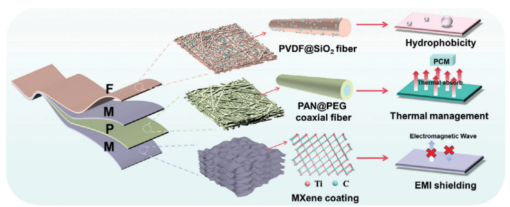 創(chuàng)新性地設(shè)計了多層復(fù)合結(jié)構(gòu)的PEG@PAN/MXene/PVDF@SiO2(PMF)復(fù)合薄膜,通過同軸靜電紡絲、噴涂和單軸靜電紡絲技術(shù),將相變材料(PEG)、導(dǎo)電材料(MXene)和疏水材料(PVDF@SiO2)有效結(jié)合,實現(xiàn)了材料的多功能化。