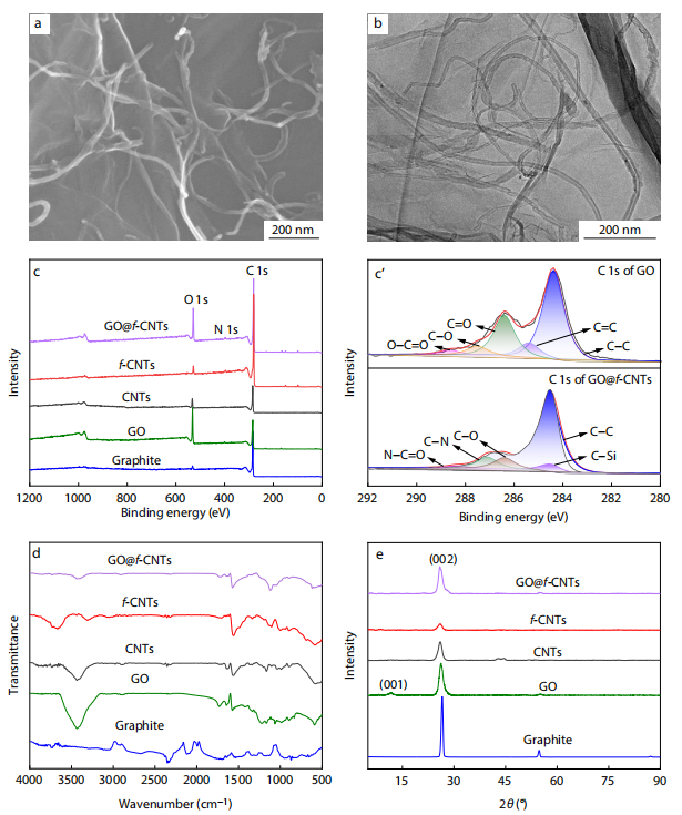 圖2. GO@f-CNTs的(a)SEM圖及(b)TEM圖;(c,c')石墨、GO、CNTs、f-CNTs與GO@f-CNTs的XPS譜圖;(d)傅里葉變換紅外光譜及(e)X射線衍射譜圖。