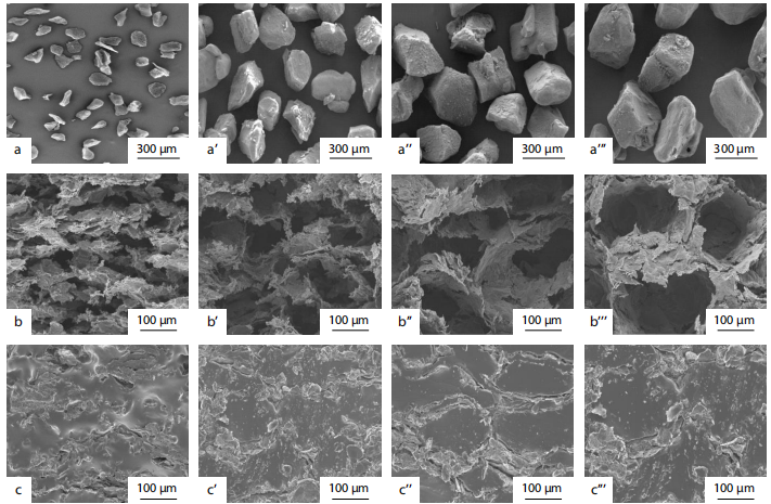 圖3. 草酸(a–a?′′′)、GO@f-CNTs導(dǎo)熱網(wǎng)絡(luò)(b–b?′′′)以及GO@f-CNTs/PDMS復(fù)合材料(c–c?′′′)的SEM圖像。